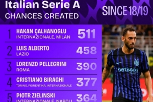 体育资讯9月7日讯 《转会市场》统计了18-19赛季以来的意甲创造机会情况,恰尔汗奥卢独自领跑。