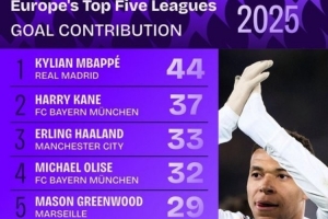 2025直接参与进球榜:姆巴佩压凯恩居首 哈兰德、奥利塞、青木前5