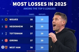 2025五大联赛负场榜:狼队25负最多,热刺、西汉姆20负并列倒二