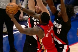 粗中有细!锡安冲击篮筐 顶住两人防守滞空拉杆上篮打中
