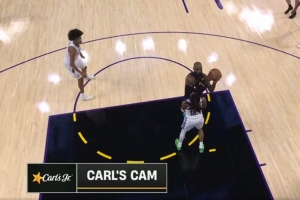 没刹住!詹姆斯切入禁区上篮被莫兰特造成进攻犯规