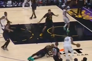 地太滑吗?詹姆斯补防GG·杰克逊 结结实实滑倒在地