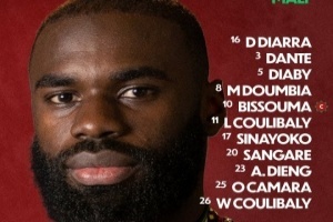 马里首发:16-D·迪亚拉、25-奥斯曼·卡马拉、3-丹特、26-沃约·库利巴利、5-阿卜杜拉耶·迪亚比、10-比苏马、11-拉萨纳·库利巴利、23-阿里欧·迪恩、20-马马杜·桑加雷、8-马马杜·敦比亚、17-西纳约科