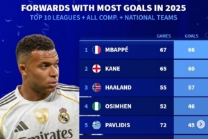 德转列2025年各项赛事前锋进球最多榜:姆巴佩、凯恩、哈兰德前三