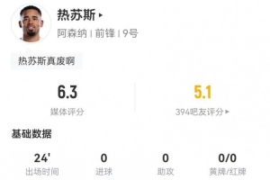 状态低迷!热苏斯替补1射门+4过人1成功 10对抗3成功 仅获6.3分