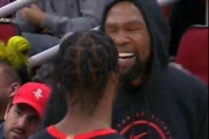 乌度卡召集大家商量策略:杜兰特与伊森捂嘴交谈!前者开朗大笑
