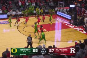 罗格斯大学两罚一中之后,落后三分的俄勒冈最后一攻,林葳运过来,还是给了比特,比特再传林葳,林葳再传,时间不够了…