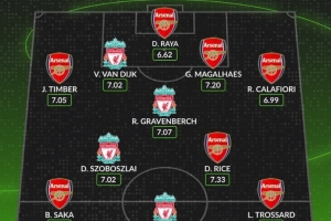 利物浦vs阿森纳本赛季评分最高阵:赖斯领衔枪手7人,索博在列
