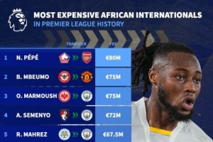 英超非洲球员转会榜:佩佩8000万欧居首,塞梅尼奥第四