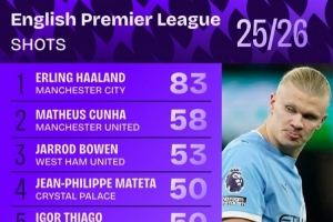 本赛季英超射门次数榜:哈兰德83次断层居首,库尼亚58次第二