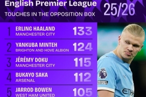 本赛季英超对方禁区触球榜:哈兰德居首,多库、萨卡、萨拉赫在列