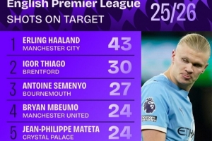 本赛季英超射正榜:哈兰德居首,塞梅尼奥、萨卡+曼联三叉戟在列