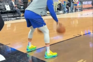 今天穿队友的鞋比赛?小吧直击:库里穿巴特勒签名鞋参加赛前训练