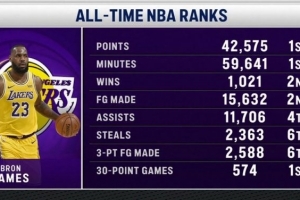 活化石!转播方晒詹姆斯各项纪录:得分、时间、30+场次第一