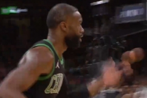 高射炮!杰伦·布朗迎着文班亚马调高弧顶命中三分球