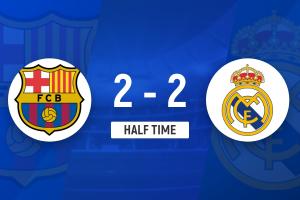 半场-巴萨2-2皇马 拉菲尼亚失单刀+破门莱万进球维尼修斯建功