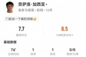 贡萨洛本场2射2正进1球+1失良机 1助攻+6对抗1成功 获评7.7分