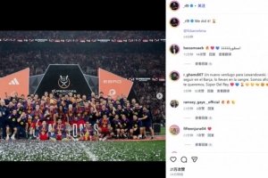 西超杯单刀破门!莱万社媒晒巴萨全队捧得奖杯合照:我们做到了!