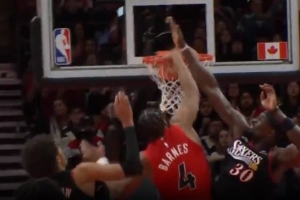 十佳球+1!斯科蒂·巴恩斯单臂举火烧天 搁着两人炸裂战斧隔扣!