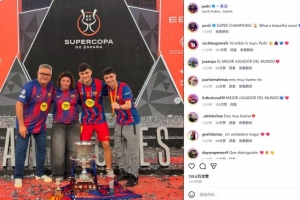 两人也都在赛后通过社媒晒出捧杯照。佩德里配文道:“超级杯冠军🏆多么美丽的词汇💙❤️”。