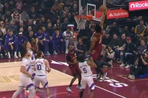 上来先扣一个!阿伦高高跃起抢断 随后快下接加兰抛传空接暴扣
