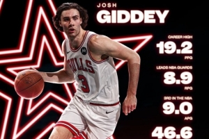 体育资讯1月13日讯 公牛官推今天发布吉迪场均数据海报,为其全明星拉票。