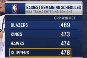 快船主场迎战黄蜂,转播方给出一项统计,剩余对手胜率排名,快船第四轻松。