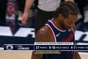 机器人!伦纳德半节独得16分 完成连续21场得分20+