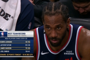 球员单场得分30+球队战绩:伦纳德带队60胜16负 哈登带队70胜24负