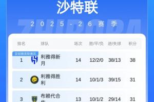 在本赛季前10轮沙特联,利雅得胜利一度全胜领跑积分榜,对新月的优势最大达到4分,但从第11轮开始,利雅得胜利遭遇1平3负,对手新月则4战全胜,一举将积分反超。