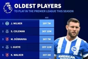 本赛季英超出场最年长球员排行:米尔纳39岁7个月最年长