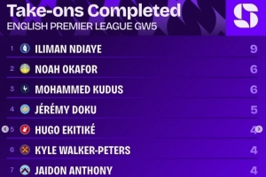 英超第5轮过人榜:恩迪亚耶9次最多,奥卡福、库杜斯各6次第二