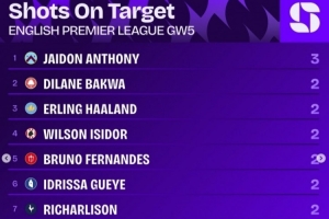 英超第5轮射正榜:杰顿-安东尼3次居首,哈兰德等9名球员两次