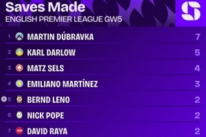 英超第5轮扑救榜:杜布拉夫卡7次最多,卡尔-达尔洛5次第二