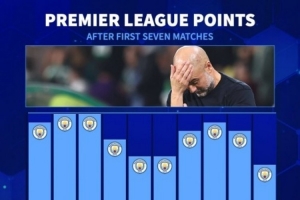 曼城本赛季英超前7轮仅积13分,瓜帅执教以来同期最低