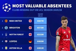 缺席欧冠球队身价榜:曼联8.87亿欧居首,布莱顿次席&米兰第六