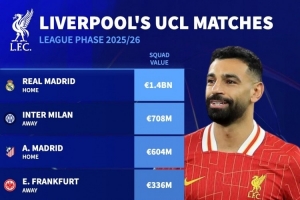 利物浦欧冠对手身价:皇马14亿欧最高,国米7.08亿&马竞6.04亿