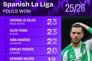 西甲被犯规次数排行:洛塞尔索23次居首,朱利亚诺-西蒙尼并列第5