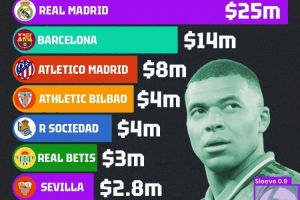 西甲衣袖广告收入排名:皇马2500万美元居首,巴萨1400万美元