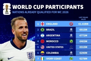 晋级世界杯球队身价榜:英格兰10.2亿欧居首,巴西、阿根廷前三