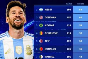 体育资讯10月15日讯 德转今日统计了球员国家队历史助攻榜,其中梅西63次助攻位列榜首,多诺万、内马尔分列二三,C罗45助第6。