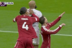 友军误伤范迪克争顶中肘击麦卡利斯特,之后曼联闪电进球