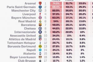 opta最新欧冠夺冠概率:阿森纳19.78%第一,巴黎曼城红军分列2-4