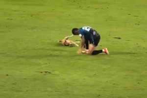 巴兰基利亚青年主场对阵佩雷拉的比赛,佩雷拉右后卫帕切科受伤倒地,一只小狗跑进球场,模仿帕切科倒地的动作。