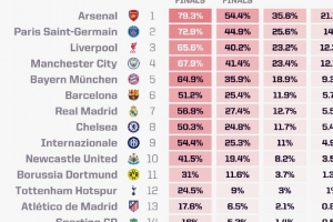 Opta欧冠最新夺冠概率:阿森纳21.13%最高,巴黎、利物浦二三位