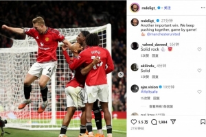 德里赫特社媒晒庆祝照:又一场重要胜利!我们继续齐心协力!