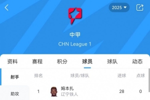 中甲射手榜:姆本扎28球领跑、埃里克斯第二、向余望18球第四