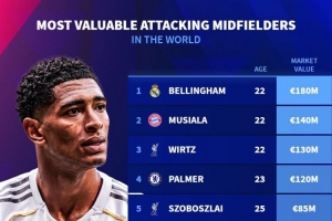 进攻型中场身价榜:贝林厄姆1.8亿欧居首,穆西亚拉、维尔茨前三