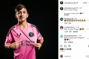 梅西儿子蒂亚戈迎来13岁生日,安东内拉社媒晒出蒂亚戈身穿迈阿密国际球衣的照片,配文:“生日快乐,蒂亚戈,我们非常爱你。”