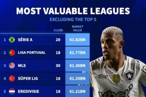 五大联赛之外联赛身价排名:巴甲18.2亿欧居首,葡超17.7亿欧第二